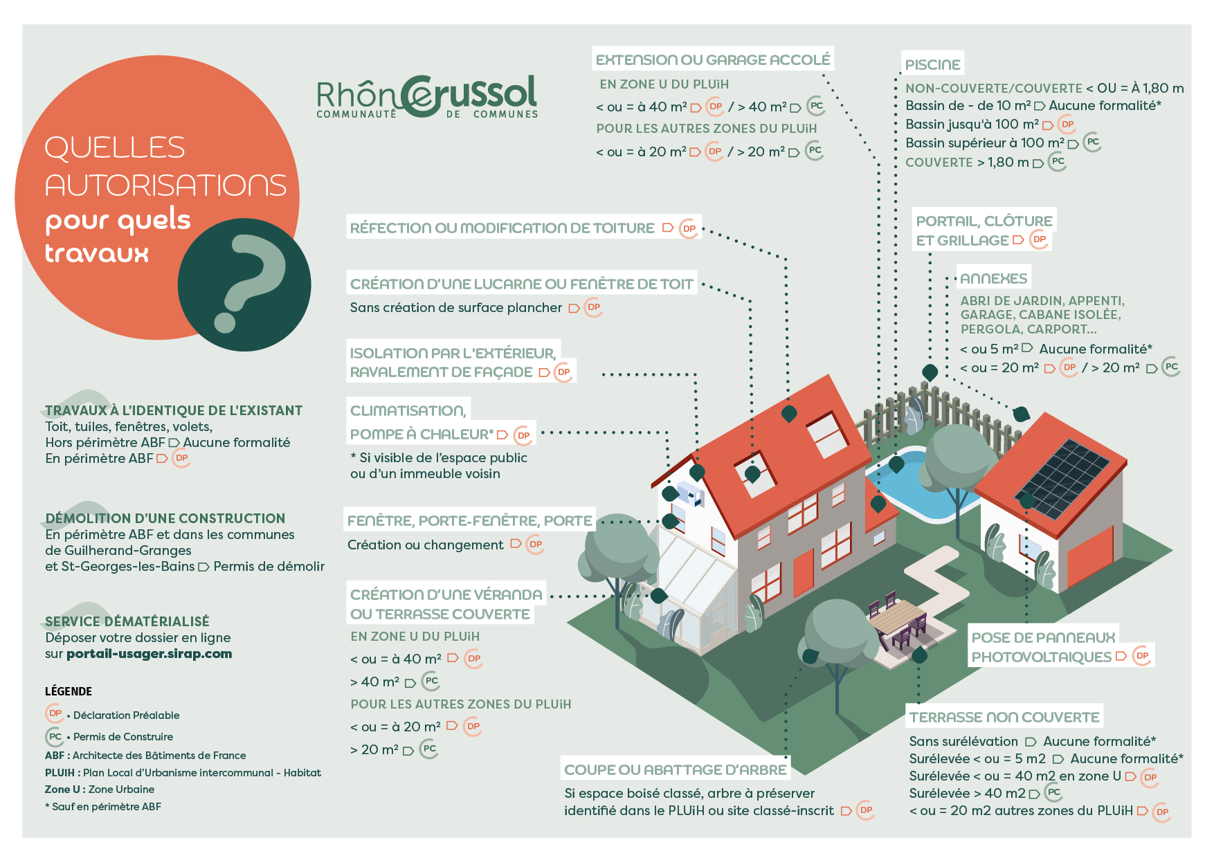 En fonction de l’importance du chantier, des modifications envisagées, il est possible de devoir recourir à une déclaration préalable (DP), à un permis de construire (PC) ou à un permis d’aménager.